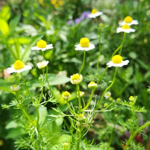 ジャーマンカモミール❀ 菜園の一角で風に揺れ 触るとフワ〜リ優しい香り🌿