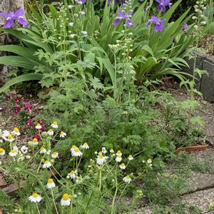 春の花壇 何だか いつもと違う感じの 花壇。 背丈が伸び、ぼうぼうしてる ①いちはつ デルフィニウム カモミール ②カモミール ポピー オルレア ビオラ ③ビオラ キンギョソウ スイトピー