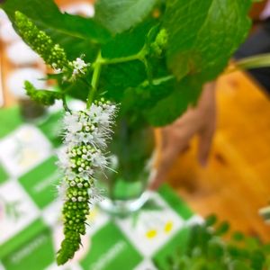和ハーブ講座にて ミントの花、可愛いです☺️ ドクダミ茶(生のよりも香りが柔らかでした)2枚目 ハマナスのドライ(3枚目) ガーデンのヤブガラシの葉にいたスズメガの幼虫(4枚目) ハマナスのバスボム(5枚目) アロマティカスの葉は毛深くふわふわでとてもいい香りでした