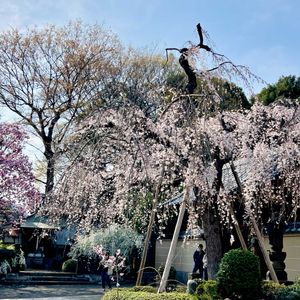 🏷️木曜日は桃色🏷️木曜日は木に咲く花 お寺の入り口。 今年も枝垂れ桜と紫木蓮と雪柳が一緒に楽しめました♪ 2枚目、門と垂れて咲く桜🌸 3枚目、枝垂れ桜と雪柳💗🤍 4枚目、菊の花手水💛🤍🩷