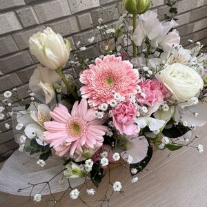 春の気配がチラホラ🌿🌸 クリーム色の ガーベラで春っぽく🌼🌱🍀 先週の桜も咲いてきました🌸 春は直ぐそこ😃💕