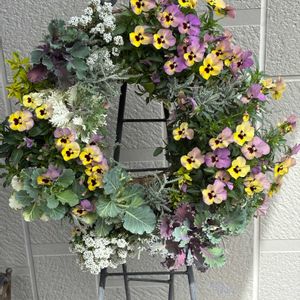 🌸🌿フラワーリース🌿🌸 このリースは初投稿 ビオラ おまつりももか やっと可愛らしく咲いてます アリッサム リーフ🌿 サントリナ 葉牡丹 伸びる度に✂️ 葉牡丹が何とか収まってます😅