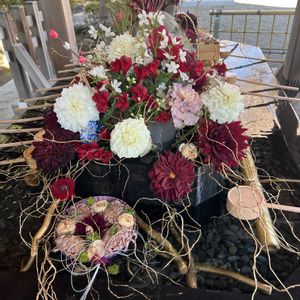 ❤️真っ赤な火曜日❤️ ダリア、バラ、ポインセチア 真ん中はラナンキユラス❤️🩷