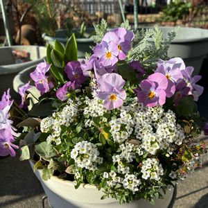アイコンを変更しました💐✨ パンジー/シルバーレース/ハツユキカズラ/ヒューケラの寄せ植え🧺と、リシマキアのミニポット🫖 暖かくなって植物たちもボリューム満点で嬉しい🌸✨