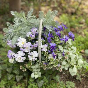 ①②花遊び教室のアレンジメント。ニュアンスカラーのパンジーがいい感じに‥ ③④こちらはパープル系で、出来上がりました。 ⑤庭から花選びをして準備するのが楽しい時間です💕