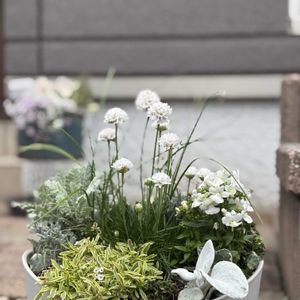 今日はもう一枚…☺️ クリスマス頃に慌てて作って うまく仕上がらずにしばらくの間放置していた寄植え…💭 2月の終わりに仕立て直しました⸂⸂⸜(*^^*) 使った植物🪴 忘れないように………φ(. . )メモメモ ❇︎アルメリア🤍 ❇︎ネメシア🤍 ❇︎スーパーアリッサムフロスティーナイト🤍 ❇︎セネシオ エンジェルウィングス🌿 ❇︎サントリーナ雪のサンゴ礁🌿 ❇︎シルバーレース🌿 ❇︎四つ葉のクローバー🍀 ❇︎フォックスリータイム🌿 ❇︎アリウムグレイスフルビューティー🤍 ❇︎アレンジ咲きチューリップ🌷