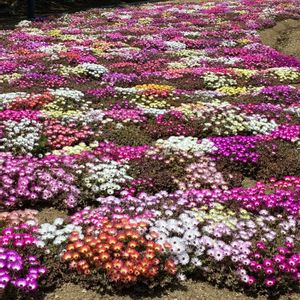 こんばんは♪ 今日は暖かくて気持ちの良い1日でした♬ 雨上がりのお庭です😊 ① 種まきっ子のリビングストンデージー満開になりました🩷💛🤍 ②パンジー&ビオラ、ムスカリのプランターも満開💙💛🧡 ③フリル咲きのパンジーも可愛いです💜💛 ④また多肉の箱庭を作りました🤭 ⑤余ったので小さな箱庭も🐤