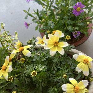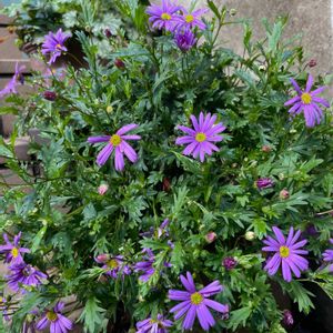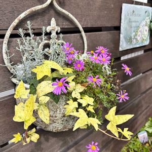 昨日の雨が上がり、今日はいいお天気になりました☀️ ①少し前に作ったブラキカムのハンギング💜ようやくお花が咲いて来ました☺️ ②暮れに投稿したギャザリングの寄せ植え。エレモフィラが咲いて来ました😆ハボタンは伸びてカット✂️しました😅