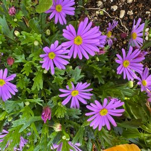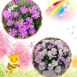 星空マムがちょうど良い感じです♪ ブラキカム可愛いから、小花のピンクが欲しいな🥰 ①②6号鉢 2色植えのバランスが今が1番良い これからは紫が多くなってしまう ③④花壇に植えた苗🌱