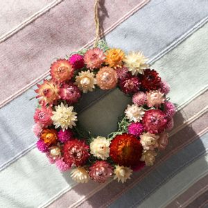 ドカンと雪が降ったと思ったら、今度は季節外れの暖気で雪が溶け、道路はツルツル路面になりました。 お散歩も出来ないし、温室にも行けないから、お家に引きこもって花遊び。 ヘリクリサムのドライフラワーリースのできあがり😊❤️