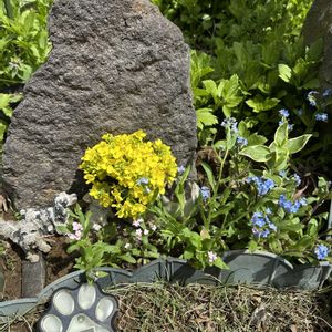 愛犬の🪦に、たくさんの菜の花と毎年咲く勿忘草 亡き愛犬との春の散歩を懐かしんでいます♪(10年目の春) 菜の花は菜園の片付けで...