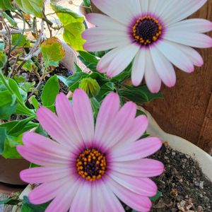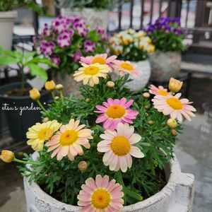 新年度の始まりはぐずついたお天気☂⋆̩*̣̣̥⁎…ʀᵃⁱⁿ*̣̣̥⁎🌧️💧 1️⃣ボンザマーガレットピンクレモネード🩷💛 3/中旬お迎え~ 2️⃣ブルーデージー 古参です ちらほらと *ˊᵕˋ)੭💙