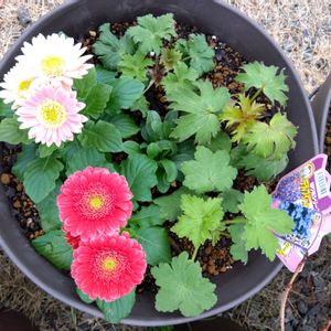 フラワーアレンジメント🌸 穏やかな時間 ガーベラ スイートピー デルフィニウム スプレーカーネーション ゼラニウム キンセンカ ソリダコ レザーファン ビオラ