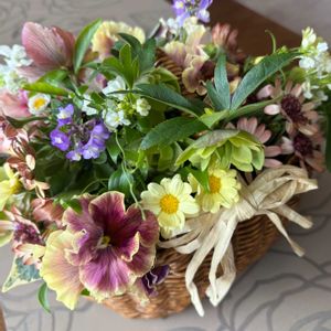 ①②花遊び教室のアレンジメント。ニュアンスカラーのパンジーがいい感じに‥ ③④こちらはパープル系で、出来上がりました。 ⑤庭から花選びをして準備するのが楽しい時間です💕