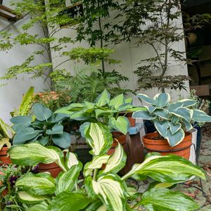 寒い雨☔ですね〜 車庫内のホスタ&もみじ🍁 1⃣ スジギボウシ 1⃣2️⃣3️⃣ ハルシオン と芽変りの ジューン、エルニーニョ マットな質感の葉で水を弾いて水玉💧にして茎を伝い株元に水を供給🚰💦 葉🌱がびちゃびちゃになったのを 見た事がないのは車庫内だからか🤣 株が大きくると芽🌱が増えるので自然と ボリュームがある草姿に🥹💖 青灰色のハルシオンを受け継ぎ ホスタオブザイヤー金賞✨🏆✨の みんな大好き…?🤔のジューン🥹💖 アソート入荷が多いホスタですが🤔💭 ジューンは12株〜24株の入荷も見かける👀💕様になりました😊 地上部の無い冬⛄️以外の季節で 葉🌱色の変化もあるよꉂ🤭♡ ホスタオブザイヤー 銀賞のエルニーニョ 外にクリームの斑入り 渋好みなのか🤔❓ 4️⃣今年🪴半分に株分けして元の鉢にin( *˙ω˙*)و グッ! 少しマットでダークな感じ ハルシオンと比べるのは酷です🙄💭 5️⃣手前〜 名無しさん (古くからある感じ) エンタープライズ(ボコボコした葉🌱) ロイヤリス(ファイヤー&アイスの芽変り 名無しさん