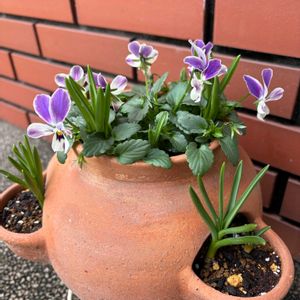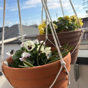 ベランダで吊るしている 2つのビオラ鉢。 朝は寒さで縮んでいるのですが 昼には顔を上げて 可愛い花姿を見せてくれます♪