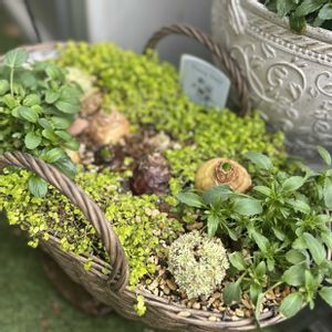 春からここに植えっぱなしのベビーティアーズに ヒヤシンス球根とムスカリ球根雲間草と モーヴビオラ2株を入れてみたバスケット🧺🪻🎶 ナチュラル風でかわいくてお気に入り ヒヤシンスを育てるの小学生ぶり笑