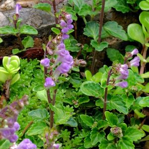 若葉の季節 タツナミソウとセダム オステオスペルマム 斑入りヤブラン セージ