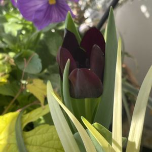 ブラックなチューリップが咲いてきました🖤 秋の寄せ植えの鉢に植えたら、ヤブランやノブドウ、ジュズサンゴの若葉と一緒にナチュラルな雰囲気に…🌿 チューリップリレー、この子達がアンカーかな。 無事咲いてくれて嬉しい〜🌷😊♪