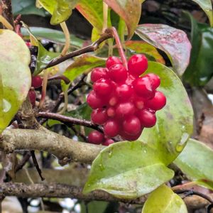 京都北の三宅天神付近で ①サネカズラ マツブサ科 サネカズラ属 たわわでした。 ②ナンテン メギ科 ナンテン属 ③ヤブラン キジカクシ科 ヤブラン属 ④何の実 ブドウのような実のつき方で藪にありました。