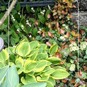 おはようございます☁☔ いつの間にかギボウシが 面積を広げてきました ハツユキカズラもキレイな葉っぱに その中に鈴蘭が顔を出しました (オリーブの枝が邪魔で鈴蘭が見えなかったので枝を切って)✿♡❀✿♡❀✿♡❀✿
