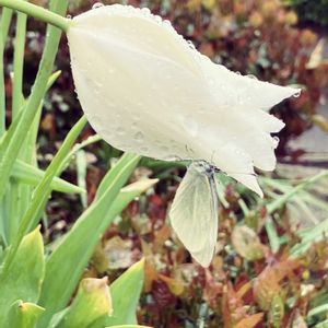 昨日の夕方から白いチューリップにモンシロチョウ 雨を察してこの場所に?葉の裏じゃなく? チューリップが倒れ守ってくれるのしってたかな🥰 芝桜とマツバトウダイ(タイヤ鉢) ツツジも次々と開花 今日の雨で満開になるかな