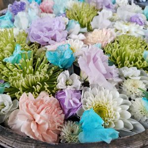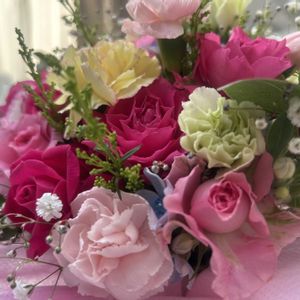 初めてのボックスフラワー、 明日会う予定の従姉へのプレゼントに。 花材は、スプレーバラ、スプレーカーネーション、ミモザ、ブルースター、アストランチア、ユーカリグーニー。 100均の箱をリボンでおめかししました。 喜んでくれるかなあ。生花アレンジメント