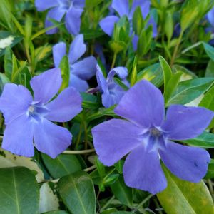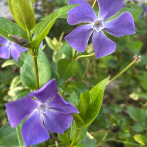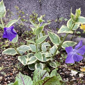 ツルニチニチソウ 鮮やかな紫色 広がり過ぎるので大きめの鉢植えにしています…。