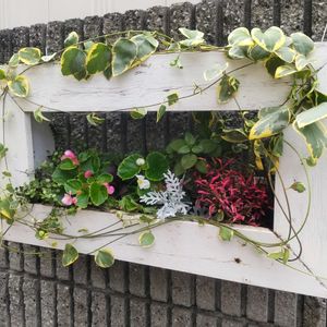 壁掛け額縁寄せ植え🩷🍀 季節毎に植え替えています。最近 アキラサンサスを加えツルニチニチソウはくるくる巻いています。風に 任せ日々スタイル変わります🌿🎶