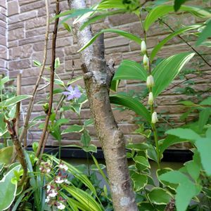 北側の小花壇にエビネ、ナルコラン、ツルニチニチソウが咲いています。 きれいな葉のフウチソウも植えてあります。