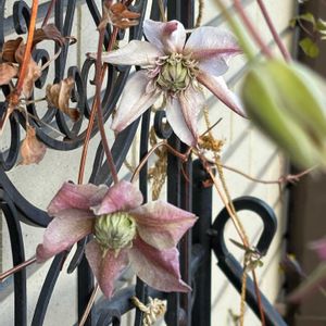 ①寒い中ポツポツ咲いてます、クレマチス水面の妖精 ②夏にほとんど消えてしまったシュウメイギクが今頃1輪だけ😅 ③バラ オリエンタルエクレール ④ラナンキュラスラックスの葉っぱ🍀 ⑤クリスマスローズの蕾 今から開花が楽しみです🤭