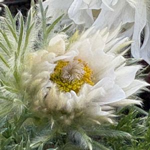 こんばんは♪今日はこちらはとても暖かい小春日和でした 11/7投稿の蕾だったオキナグサが何とか咲いてくれました 寒さでダメかと思いましたが暖かい日が何日か続いたのが良かったのかもしれません 花弁に見えるのは萼片ですが、ちょっといびつに開いています でもそこも健気でいいなあと思いました🥰 2枚目はツメレンゲです 満開になった後ですが、何故か小さな花の芯の所がピンク色になってきて可愛い🩷 西洋ミツバチが吸蜜に勤しんでいました 🏷️白い水曜日♡ 🏷️白い貴婦人✨