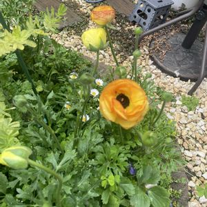 いい☂️が降りました🐸。 ①ラナンキュラスラックス・リュキア なかなか綺麗に咲いています✨️。 ②瀕死の球根から育てたラナンキュラス こちらもいい色❤️。 ③お花モリモリ🟡ゴールデンクラッカー🎉、ノースポール🤍、隠れてるラベンダー🪻。 ④お向かいさんと立ち話中の👵と🐕️σ(゚∀゚ )オレ ⑤クリソセファラム🟡もうすぐ咲きそうです。