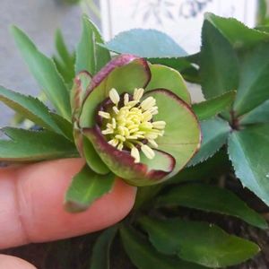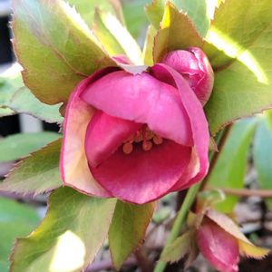 雪が解けた庭で、クリスマスローズ第一号が少し開き始めていました❇️💓❇️🥰