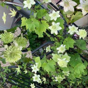 クレマチス 白万重 去年の母の日のプレゼント とっても沢山咲いてきました 古い蔦に絡ませて咲いていましたが その蔦が葉っぱ出て来ました 葡萄の葉っぱの様です🍇🍇