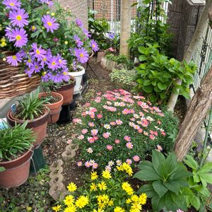玄関アプローチ 秋に寄せ植えしたのがまた伸びて満員になったので植え替えたり…🩷 色合いを観ながら…。 蝋梅の新葉が伸びて、このまま上手く育って欲しいなぁ💕❤️