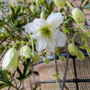 🧚♀️クレマチスカートマニージョー Clematis x cartmanii Joe'🧚♀️ 比較的小輪の白い花が早春に咲くクレマチスです。 可愛い苗をお迎えしました💕 春に小輪の可愛らしい白花を株いっぱいに咲かせるカートマニージョー🍀 淡いグリーンの蕾に純白のお花が可憐で清楚なたたずまい(ღ*ˇ ˇ*)。o♡ 常緑性なので、濃いグリーンの葉は、お花のない時期でも楽しむことができます✨ 花言葉:「精神の美」「旅人の喜び」
