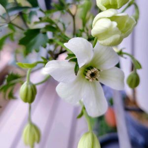 クレマチス2026🌸シロバナハンショウヅル ③ 蕾は雪おこし❄️ フェンスからだいぶはみだしちゃって どんな風に咲くかな