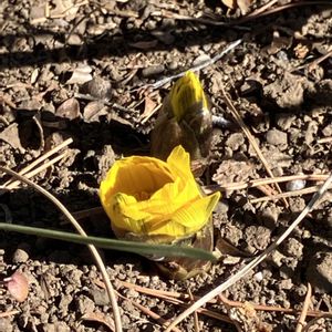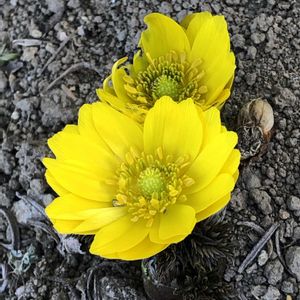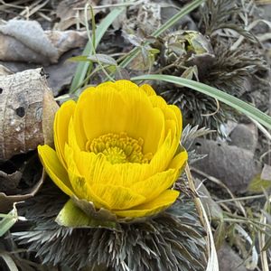 フクジュソウ(福寿草) 朝の散歩で府中のいとこが見つけた💛💚 家の前の🅿️で踏まれもせず盗られもせず 毎年出て来るらしくて今年もホッとしたと 健気だね〜春だね〜☘️
