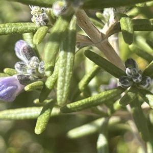 今日のお花 ローズマリー 今朝の庭 まだ蕾が固いです 後ろに月桂樹 良いかほりが手に付きました 朝は寒かったけれど明日から暖かくなるそうですね