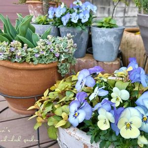 ★ビオラの寄せ植え𓂃 𓈒𓏸◌①② リシマキア"リッシー”の葉色と ビオラの花色を合わせました このビオラは種からで他にも複数苗が有ります♪ シンプルなお花だけどこの色合いで充分楽しめます♪ F1フローラルパワー ブルーピコティ/タキイ種苗 ★チューリップの寄せ植え𓂃 𓈒𓏸◌①③④ 周囲に植えたグレコマ"バリエガータ”の 小花が咲き出しました(*˘︶˘*).。*♡ このチューリップの開花は もう少しかかりそう