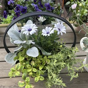 冬からの寄せ植え、ハボタンが伸びて花が咲いたり、スーパーチュニアが勢いづいたりで、バランスが変わりながら楽しめています♪ 暖かくなってヘデラの葉色がきれいなグリーンに戻りました。 脱落したのはネメシアだけです。 ネメシア苦手です😢