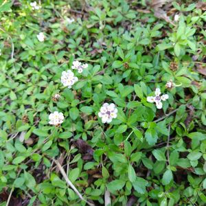 歩道にへばり付くように生えているヒメイワダレソウ。 小さな白い花を咲かせています。 どこかのお家から逃げ出して来たようにも思えますが、帰化植物で広がらないように重点対策外来植物に指定されているそうです。