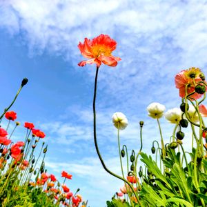 房総、千倉の花畑Part2 ポピーも素敵でした✨️ ①青空に映える〜✨️娘(新小3)撮影📸 ②〜④色とりどりのフワフワなポピーにうっとり🩷