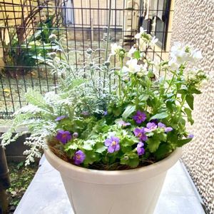 こんにちは😃 寒波からの今日の日差しは貴重です☀️ 寄せ植えの隙間にバコパを入れてみました✨ ビオラや葉牡丹を引き立てる 小花が可愛いですね💕