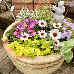 今日のお花『サクラソウ』🌸と ウチ🏠の小さな庭のお花達🌼 ①今日のお花『サクラソウ』🌸 ウチ🏠で植えているサクラソウ達。 下の小さな花🌸は『玉咲きサクラソウ』の今の状態💦 冬にセット苗でお迎えして葉っぱ🌱はすぐに枯れていき、大丈夫かぁ?と思いながら観察していると3月も半ば過ぎになって葉っぱ🌱が復活してきました。ここへきてようやく花🤍🩷💜が咲き始めました😅💦 ボール状の可愛い花🤍🩷💜になるそうなので楽しみ😊🎶 ②アジュガ『バーガンディグロー』🤍🩷のお花💜が咲き始めました。 サクラソウ『古都さくら』🩷とカラフルネメシア🩷💜との寄せ植えで足元が冬場少し寂しかったところに葉っぱ🌿の色味も良くなり、そのうえ花💜も咲いてきて華やかになってきました💓 ③去年寄せ植えの中で咲いていたローゼンセマム『エルフピンク』🤍🩷 おひとり様にして植え替えてました。ツボミの期間が長くて💦、ようやく咲いてくれました👍✨ 少しピンク🩷が薄いんだけどね💦 周りのビオラ達💜🤍💛🩷もモリモリ咲いています。 ④近所のスーパーでお買い得の苗🌱を見つけ、植えていました。 1つは『矢車草』🩷、近くでモリモリのグリーン💚は『ギリア レプタンサ』💜 矢車草がまさかのこんな長身になろうとは❣️…ちょっと笑えます🤣 ギリアの方はタグ🏷️の写真に魅せられてお迎え💕…ポンポン🟣のように咲くみたいで、これも楽しみ🎶 ⑤正面のピンクのお花🩷はこれもスーパーで見つけたラナンキュラスラックス『ヘラ』🩷 遠い園芸店で半額で買ったラックス『ベスタリス』🧡はすぐに枯れてしまったのに、コレは元気👍✨ 半額価格がスーパーでは同じ金額🤔 その向こうで去年から夏越しした白のアリッサム🤍がモリモリし過ぎて、コレも笑える😆 庭のお花達の育ち方も色々あって面白いです😅 今日2投目の投稿でした😊✨