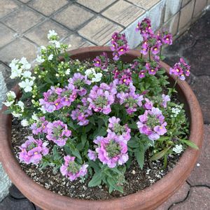 新しい鉢を買ったのでどうしても新しく寄せ植えを作りたくなって😃 桂楓園さんのフェデネージュ和 ネメシア プリムラホワイト アリッサムミックス