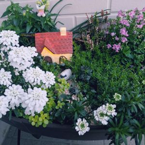 ミニチュアガーデン 花たちがモリモリで羊もお家も隠れそう🏠️ 日が暮れて灯りがともりました