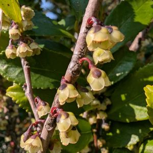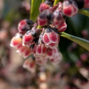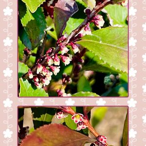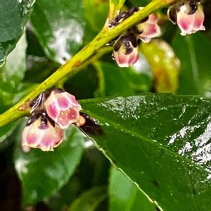 ベニヒサカキ 枝にビッシリと小花が下向きに咲いている 木曜日は桃色🏷 雌雄異株で、これは雄しべがぎっしりと詰まっている雄花のようだ🩷近くに雌株がないかと見回してみるが見当たらない(´⌓`)ムシはどこまで花粉を運ぶのだろうか‥‥ 互生する葉は光沢があって、縁には鈍いギザギザがある🟩 萼片も花柄も暗い色をしている 木曜日は木の花⚫
