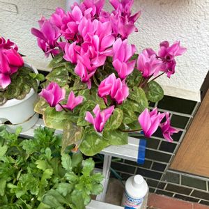 シクラメン今を盛りと咲きまくり😄花色も薄いピンクに濃いピンクの刷毛目が入り出す。 球根は3つに増えました。古そうな大きく垂れ下がる葉を取り去り、葉組みをして蕾に日が当たるように。蕾まだまだ沢山あります👍 赤紫のシクラメンも蕾まだあるけどもうこの鉢じゃ窮屈そう。 植え替えしなくちゃ💦